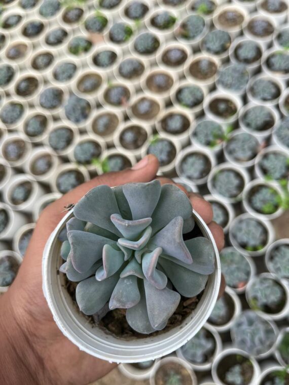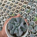 Echeveria runyonii ‘Topsy Turvy’ is a unique and eye-catching succulent known for its distinctive, twisted, and contorted leaves. The leaves are pale silvery-blue to light green and are arranged in a rosette form, curving upward and inward, giving the plant its “topsy-turvy” appearance. This plant is popular for its unusual look and easy care, making it a favorite among succulent enthusiasts.