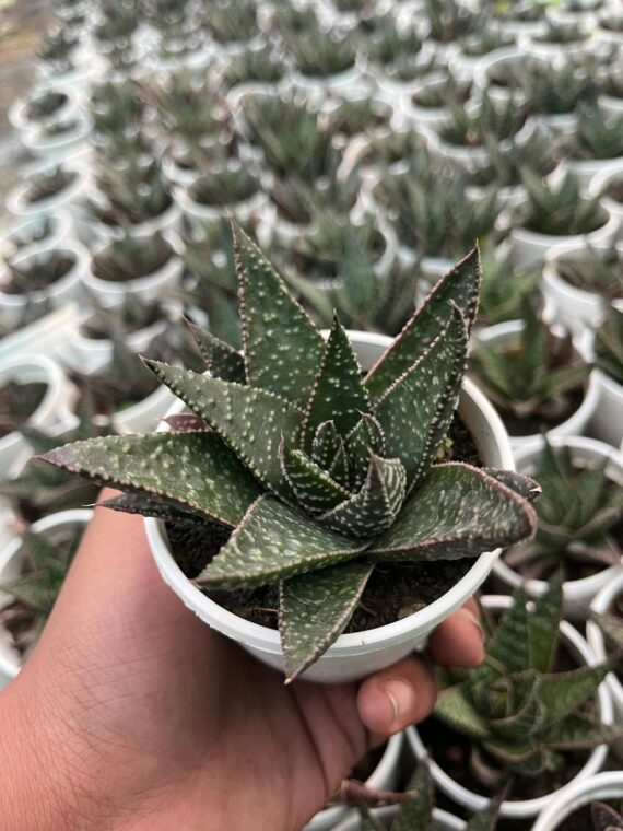 - Leaves: The leaves are thick, fleshy, and usually dark green with white spots or stripes, typical of Gasteria and Aloe species. They are arranged in a rosette pattern and may have rough or textured surfaces.