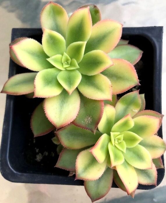 - Foliage: Aeonium haworthii has rosettes of small, spoon-shaped leaves that are a pale green to yellow-green, often with red or pink edges, especially when exposed to bright light. The leaves have a slightly glossy texture and are arranged in tight, symmetrical rosettes that can resemble a pinwheel, giving rise to its common name.