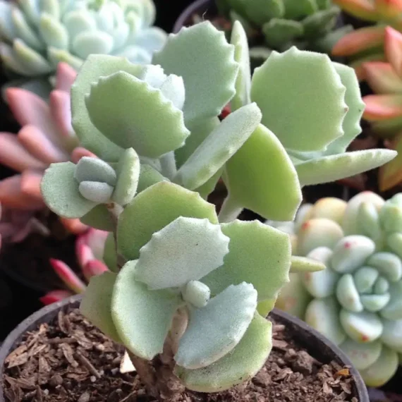Kalanchoe millotii is known for its unique, silvery-green leaves with a fuzzy texture and reddish edges. It’s a low-maintenance plant that adds a distinctive touch to succulent collections.
