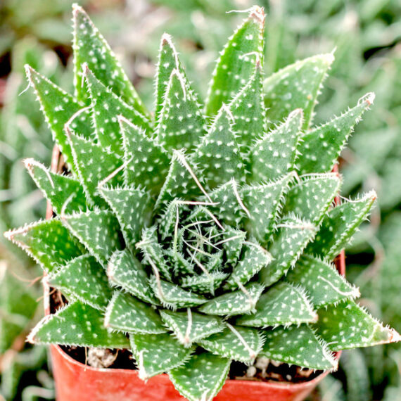 - Leaves: Aloe aristata has thick, fleshy, triangular leaves arranged in rosettes. The leaves are typically green with white, tooth-like markings or “teeth” along the edges. The leaves have a somewhat spiky or lacy appearance due to these white teeth.
