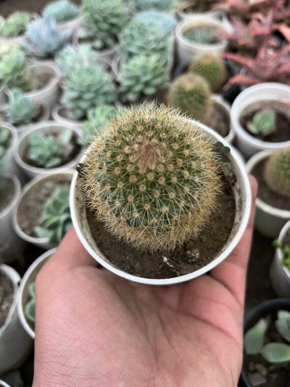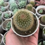 • Body: The cactus has a globular to cylindrical shape, with a typically cylindrical or slightly ribbed body. It can grow to about 10-15 cm (4-6 inches) in height and width.