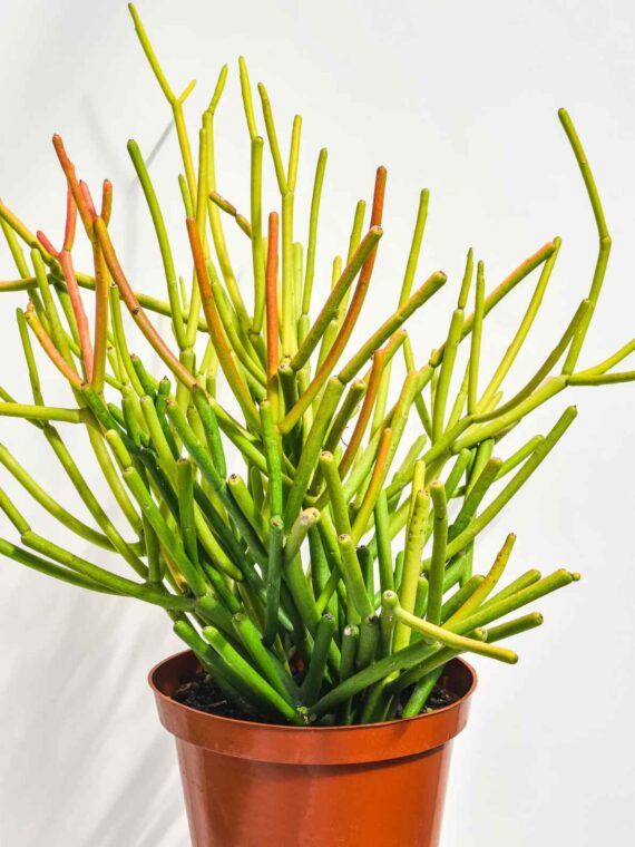 - Stems: The Pencil Cactus has thin, pencil-like stems that are typically green but can turn red, orange, or yellow when exposed to stress or intense light. The stems are jointed and can grow quite tall, often branching out from the base.