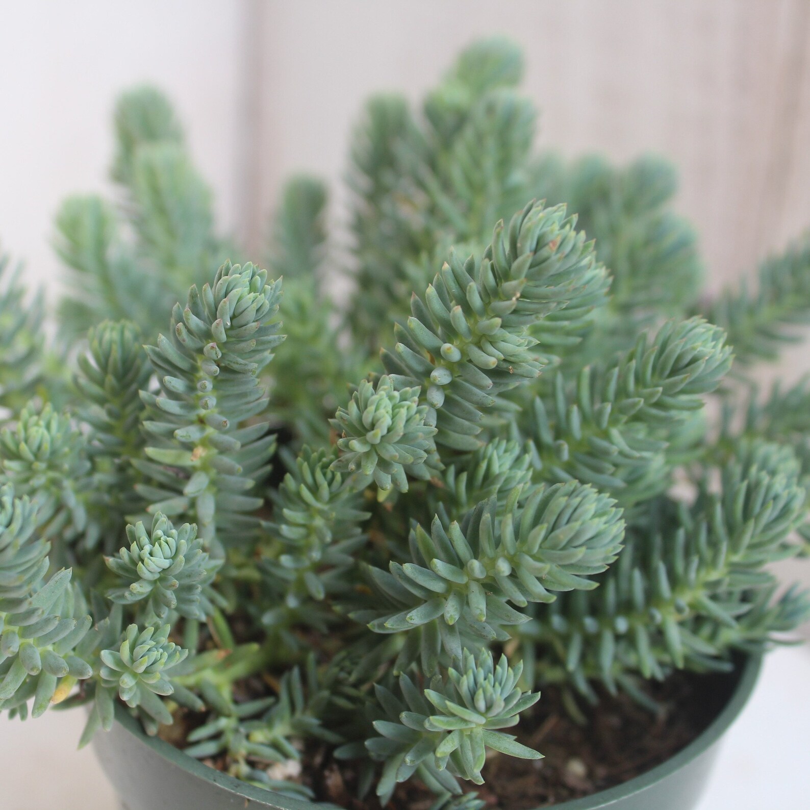 Sedum reflexum (also known as Sedum rupestre or Blue Spruce Stonecrop) is a hardy, low-growing succulent known for its blue-green, needle-like foliage that resembles the needles of a blue spruce tree. This plant is popular for its ornamental appeal, often used in rock gardens, ground covers, and container arrangements.