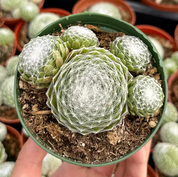 - Appearance: This plant is renowned for its rosettes of fleshy leaves covered in fine, web-like hairs, which give it the “cobweb” appearance. The leaves are usually green or grey-green with a powdery coating and can have reddish or pinkish tips, especially in bright light.