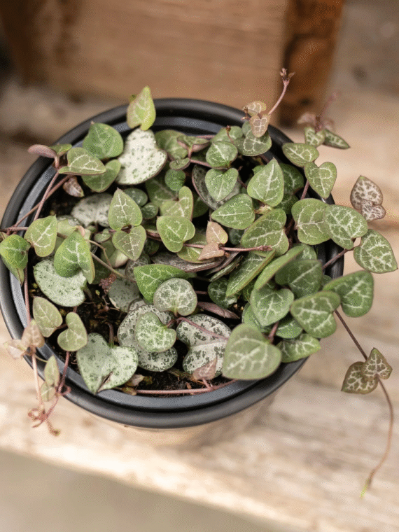 String of Hearts (Ceropegia woodii) ‘Stort’ likely refers to a specific variant of the plant that is larger or more vigorous than the typical form. While the standard String of Hearts has small, delicate leaves, some varieties can feature larger or more robust growth, which may be what ‘Stort’ indicates.